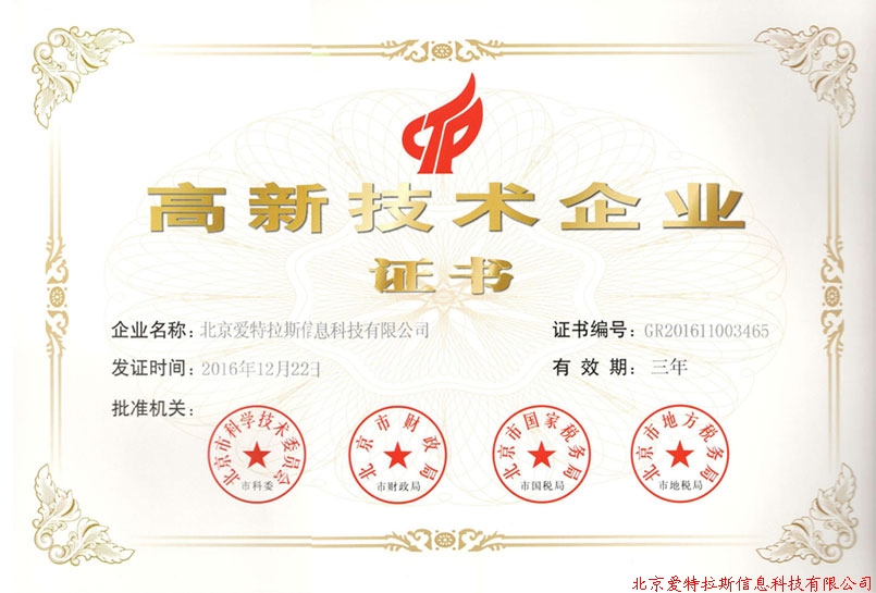 喜訊!2016年12月22日,北京愛(ài)特拉斯信息科技有限公司被評為國家高新技術(shù)企業(yè)。高新技術(shù)企業(yè)屬于國家重點(diǎn)支持的具有高成長(cháng)性的創(chuàng )新型企業(yè),具有潛在的科技和創(chuàng )新價(jià)值。獲得高新技術(shù)企業(yè)認證,表明公司具備較強的創(chuàng )新意識、較高的市場(chǎng)開(kāi)拓能力和經(jīng)營(yíng)管理水平,大大提升公司的品牌價(jià)值。