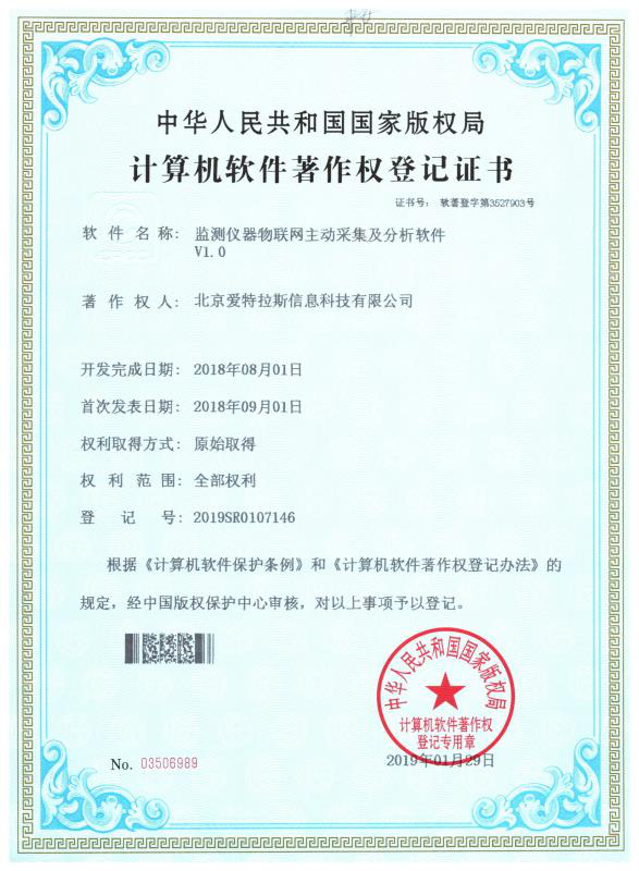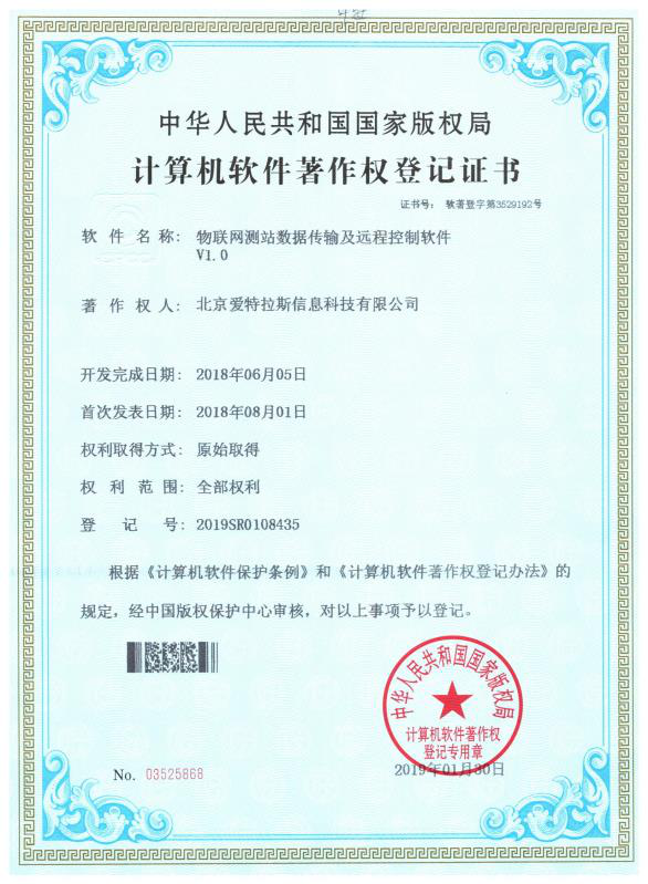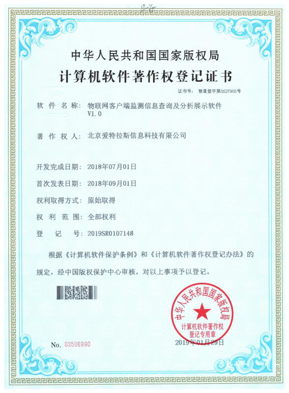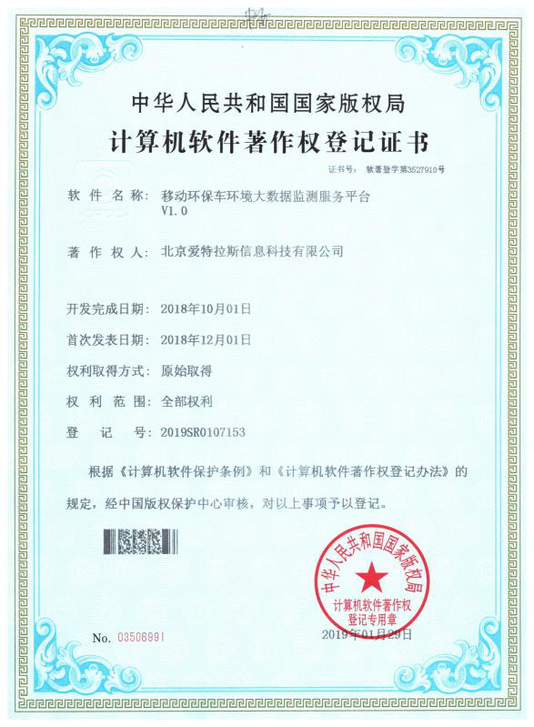 喜訊!我公司又榮獲“移動(dòng)環(huán)保車(chē)環(huán)境大數據監測服務(wù)平臺”、“物聯(lián)網(wǎng)客戶(hù)端監測信息查詢(xún)及分析展示軟件”、“監測儀器物聯(lián)網(wǎng)主動(dòng)采集及分析軟件”、“物聯(lián)網(wǎng)測站數據傳輸及遠程控制軟件”4項計算機軟件著(zhù)作權。