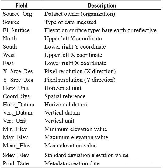 為了便于使用者使用,GMTED2010產(chǎn)品中還包含一份SHP格式的元數據,通過(guò)該元數據可以快速獲取指定區域GMTED2010產(chǎn)品的概覽信息,元數據屬性表如下
