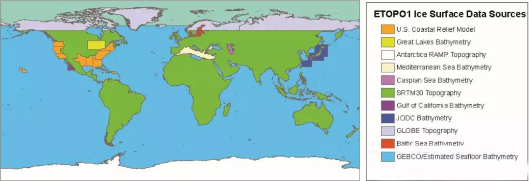 NGDC于2001年、2006年陸續發(fā)布了ETOPO2的兩個(gè)版本,提供5弧分經(jīng)緯度網(wǎng)格的陸地和海洋高程;2008年8月NGDC發(fā)布了ETOPO1版本,提供全球范圍1弧分經(jīng)緯度網(wǎng)格分辨率的陸渡和海洋高程,分為Ice Surface和Bedrock兩個(gè)版本,兩個(gè)版本差別在于處理南極洲和Greenland區域數據時(shí),Ice Surface給出的是加上冰蓋層之后的高程,Bedrock給出的是巖床的高程。ETOPO1是目前可以免費使用的唯一提供海洋高程的全球DEM數據。