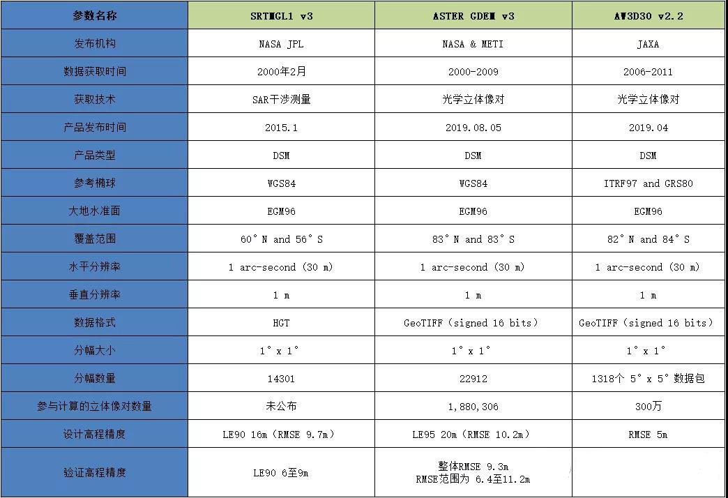 最后,就三個(gè)免費全球DEM數據產(chǎn)品而言,SRTM Plus具有最好的垂直精度,ASTER GDEM具有最大的覆蓋區域,ALOS AW3D30具有最好的數據現時(shí)性。下面是關(guān)于三個(gè)免費全球DEM數據的屬性對照表
