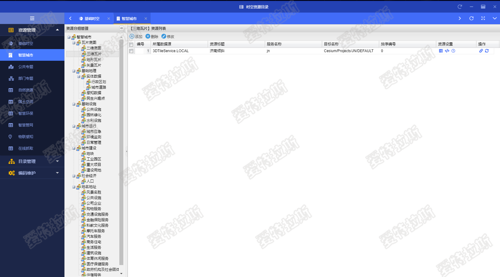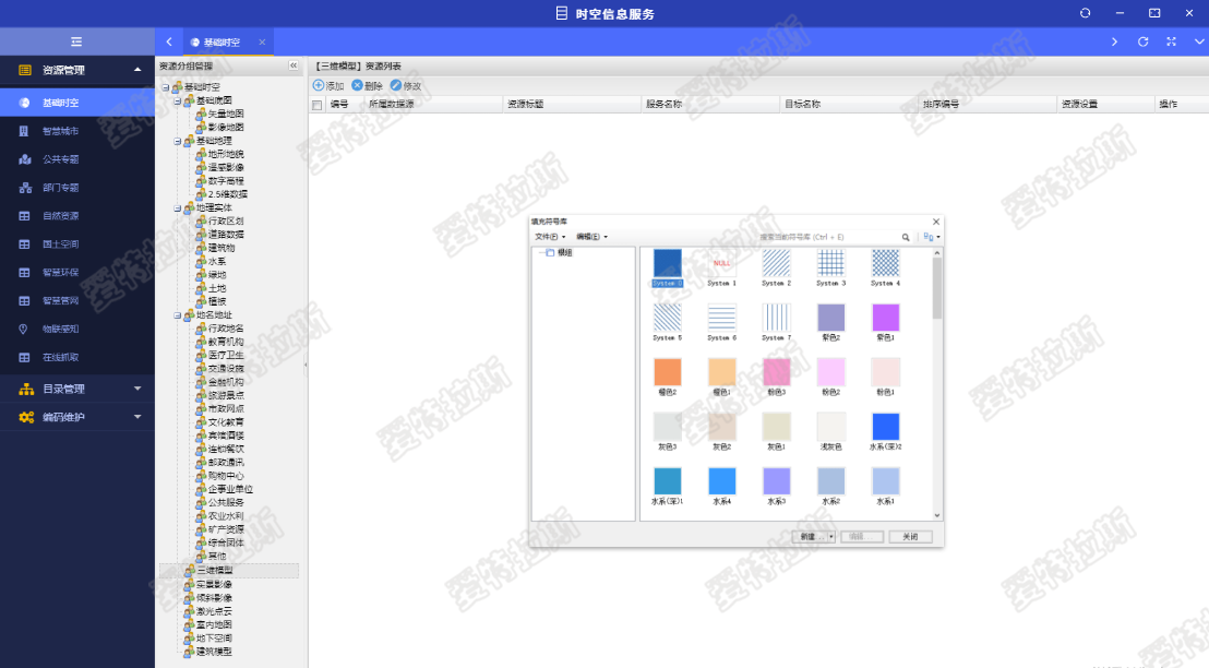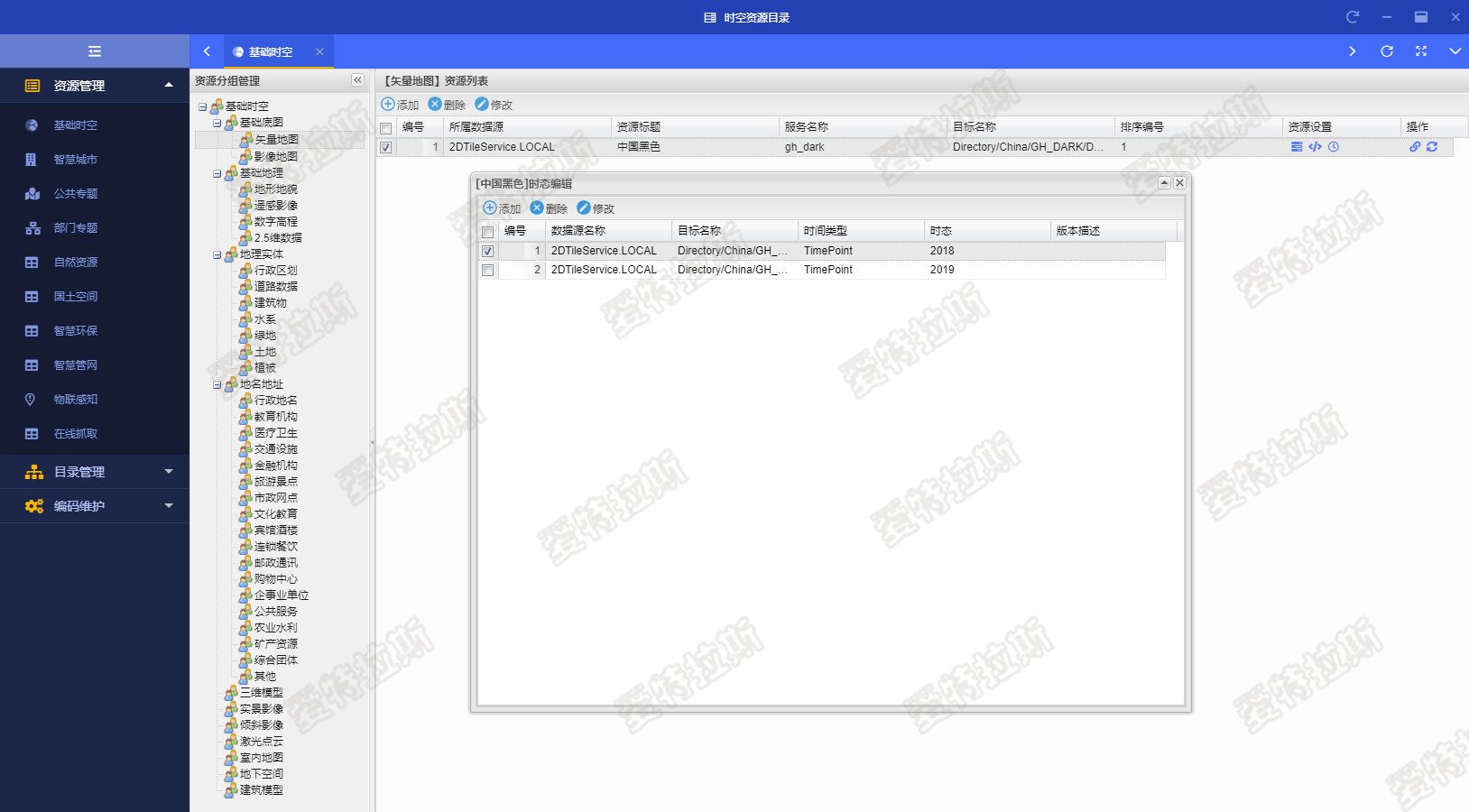 通過(guò)資源目錄的形式,實(shí)現對數據的管理,每類(lèi)數據對應一個(gè)數據源,每一個(gè)圖層對應一個(gè)數據集,系統提供對數據源、數據集及字段信息的增刪改操作,實(shí)現對數據資源的管理維護。