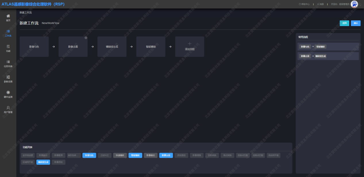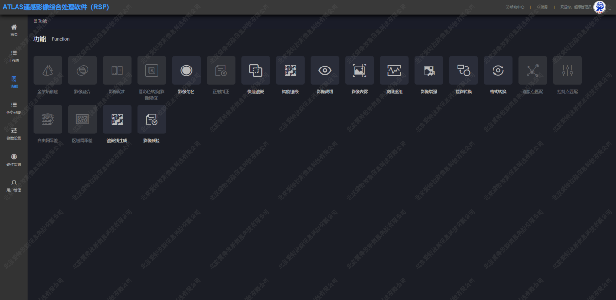 ATLAS-RSP在常規生產(chǎn)流程外,根據業(yè)務(wù)和客戶(hù)需求,研發(fā)了63項數據處理模塊及功能工具集,方便用戶(hù)處理各類(lèi)數據和解決不同的處理需要。功能涵蓋大氣校正、輻射定標、區域網(wǎng)平差、正射糾正、影像融合、DSM/DEM 生產(chǎn)、勻光勻色、智能鑲嵌、分幅裁剪、配準糾正、數據投影轉換、AI檢測、影像質(zhì)檢等63項數據處理模塊及功能工具集。