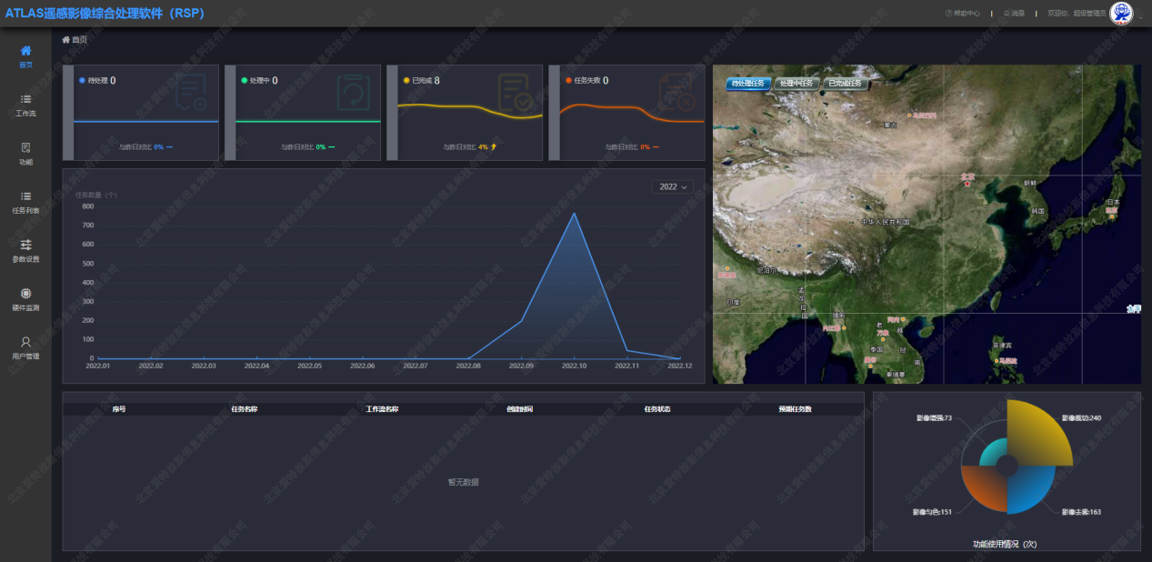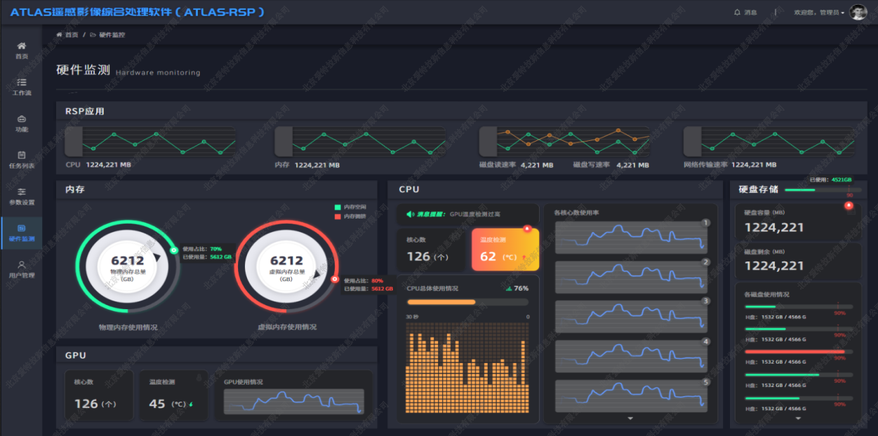 面對國內自然資源衛星頻頻發(fā)射,大批量遙感數據的快速處理成為各家不得不面對的問(wèn)題,公司本次發(fā)布的ATLAS-RSP2.0正式版主要針對性解決遙感大數據快速處理問(wèn)題,以及多源、多載荷(光學(xué)、雷達、高光譜)的遙感圖像處理問(wèn)題,ATLAS-RSP2.0正式版在處理精度、效率、質(zhì)量等方面都有大幅提升,新架構帶來(lái)了處理任務(wù)的可視化,既可實(shí)現C/S涉密環(huán)境下的離線(xiàn)部署及處理,也可實(shí)現B/S模式下的在線(xiàn)部署及處理;即可實(shí)現單機單工作站單服務(wù)器處理,也可實(shí)現多機多核多集群并行處理;同步上線(xiàn)了“硬件監控”和“幫助中心”,提高用戶(hù)的使用體驗。