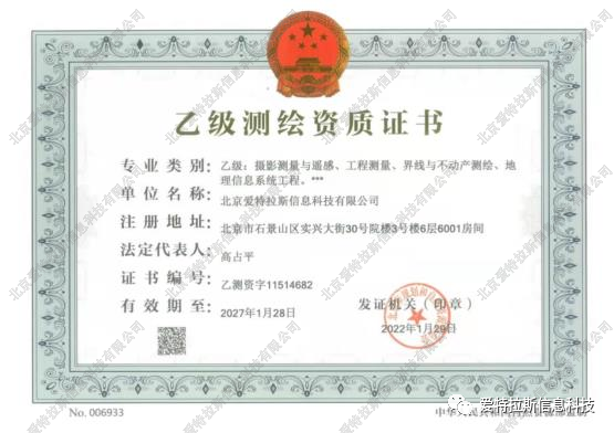2022年,北京愛(ài)特拉斯信息科技有限公司喜獲乙級測繪資質(zhì),含攝影測量與遙感、工程測量、界限與不動(dòng)產(chǎn)測繪、地理信息系統工程。明年升級甲級測繪資質(zhì)。